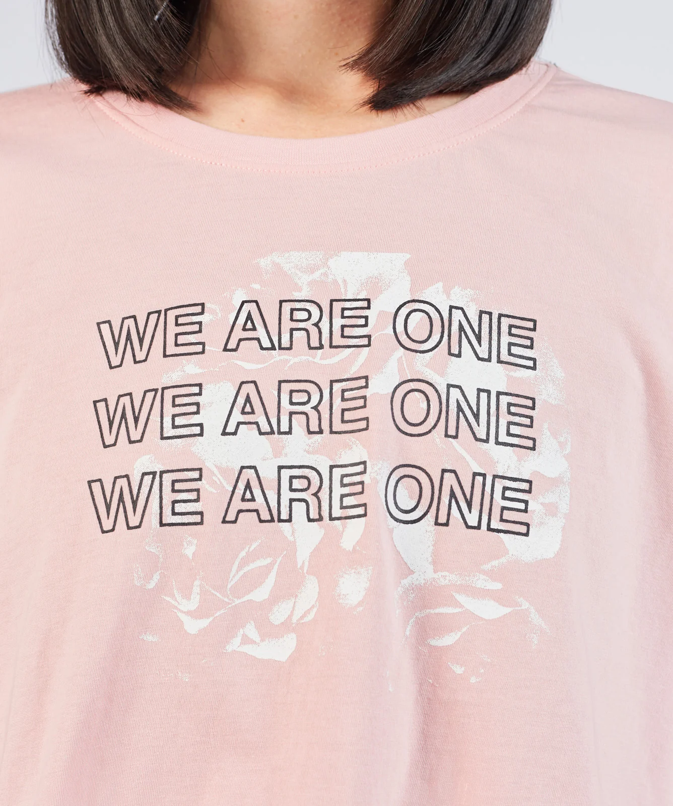 We Are One Crop Tee is our standard crop tee with a loose relaxed fit. Available in black and pink.